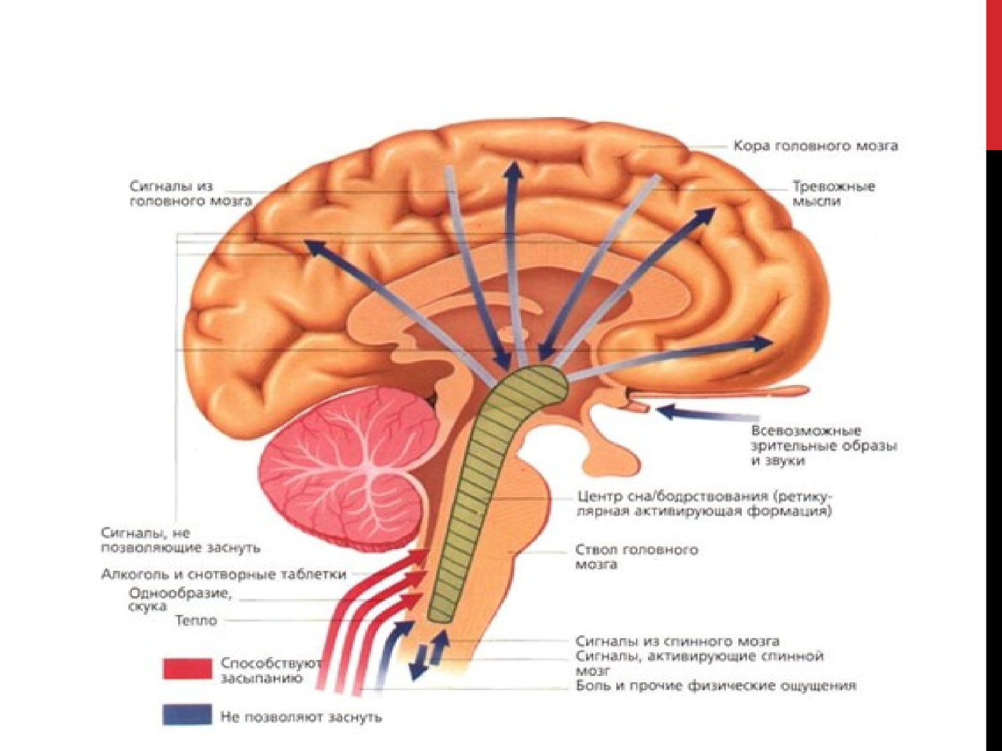 4. Нейроны РФ высоко чувствительны к химическим воздействиям (они легко блокируются снотворными средствами, барбитуратами). Это явление используется для снятия возбуждения у психически больных людей, что вызывает наркоз или сон.