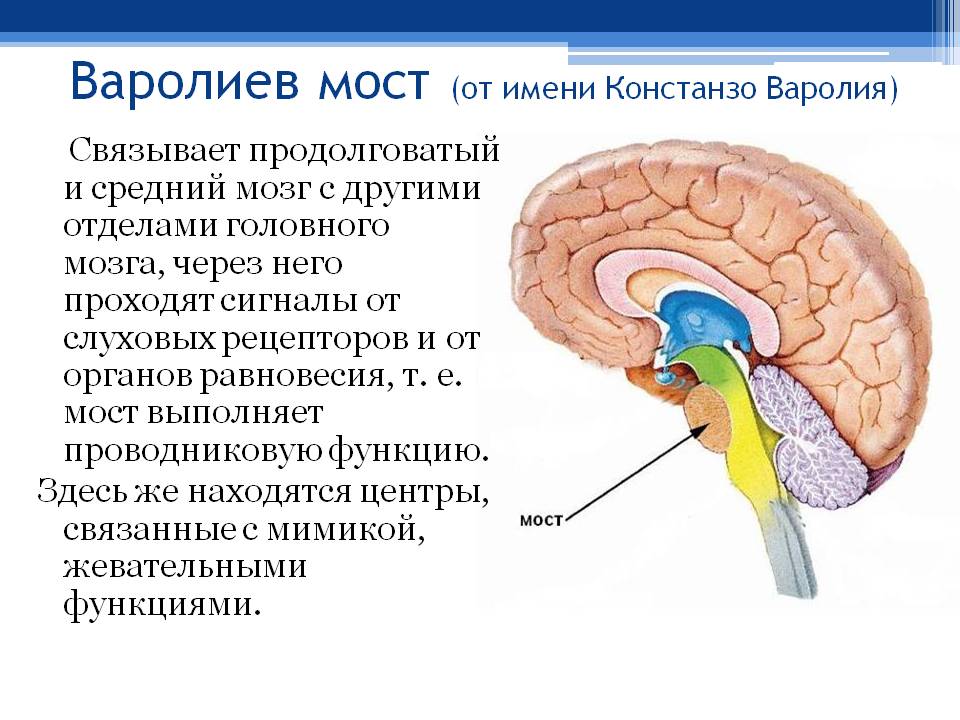 Варолиев мост- одна из структур ствола мозга, функционально тесно связанная со средним мозгом. Функции моста определяются входящими в него структурами. Через мост проходят все восходящие и нисходящие пути, связывающие передний мозг со спинным мозгом, с мозжечком и другими структурами ствола.